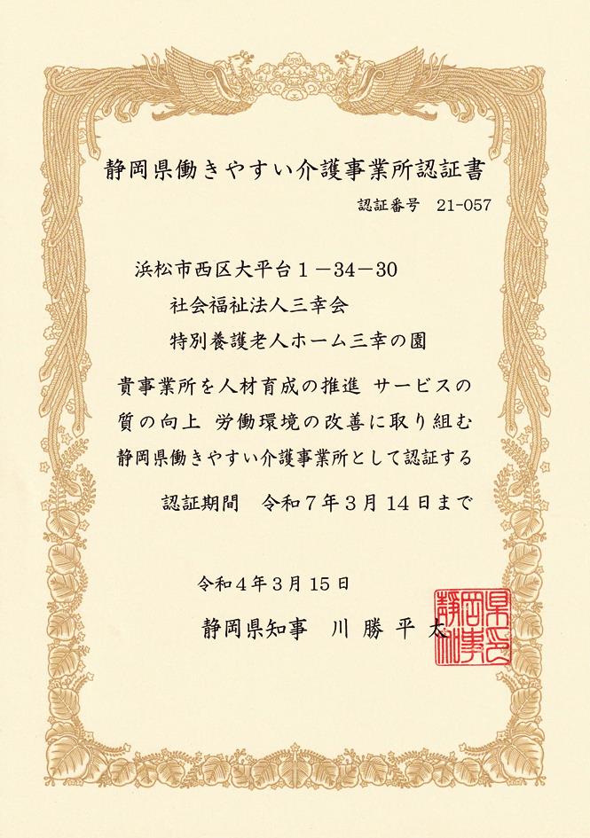 社会福祉法人三幸会では静岡県より以下の2事業所の認証を受けました!