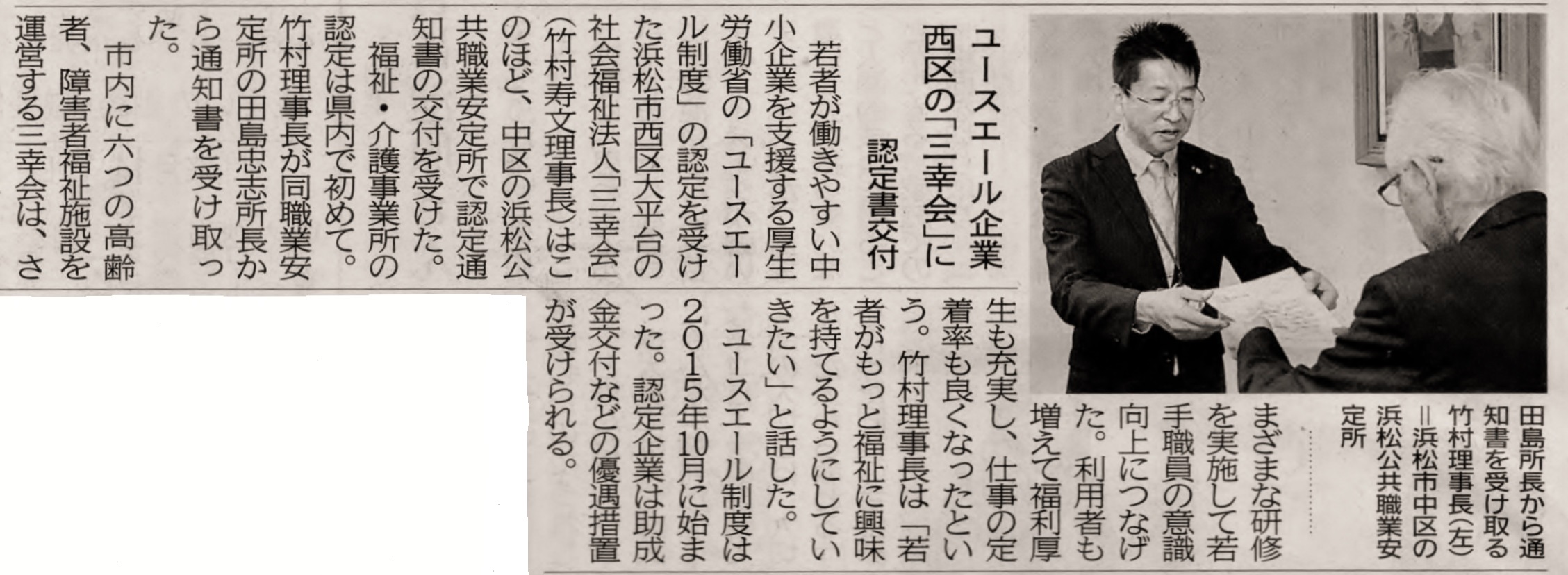 社会福祉法人三幸会では厚生労働省より静岡県内5番目、全国でも119番目に認定を受けました!