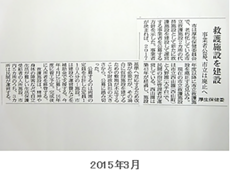 平成27年3月、浜松市は、老朽化している救護施設浜松市立入野園と浜松市立西山園を廃止し、両園の定員を合計した定員110人の代替え施設を建設して運営する事業者を公募する方針を示しました。
