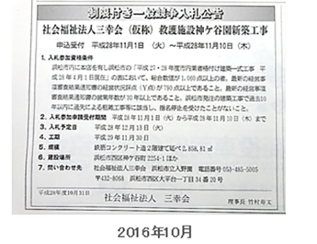 2016年12月13日 神ケ谷園新築工事入札を執行し、工事業者の確定