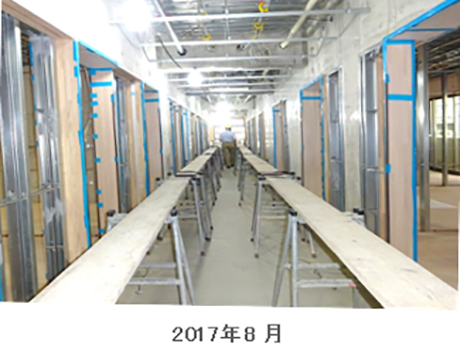 2017年8月 トップライトが付き、外からは見えませんが天井内の設備配管が始まりました。園内の様子を見ると完成が楽しみになってきますね。