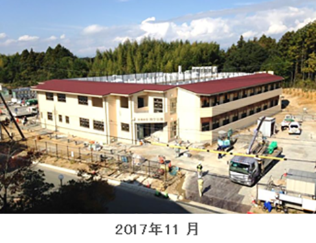 2017年11月 外観が見えてきました。外回りにも取り掛かり完成まであと少しです。駐車場を舗装し、その周りには樹木を植えて待ちに待った神ケ谷園まであと一歩!